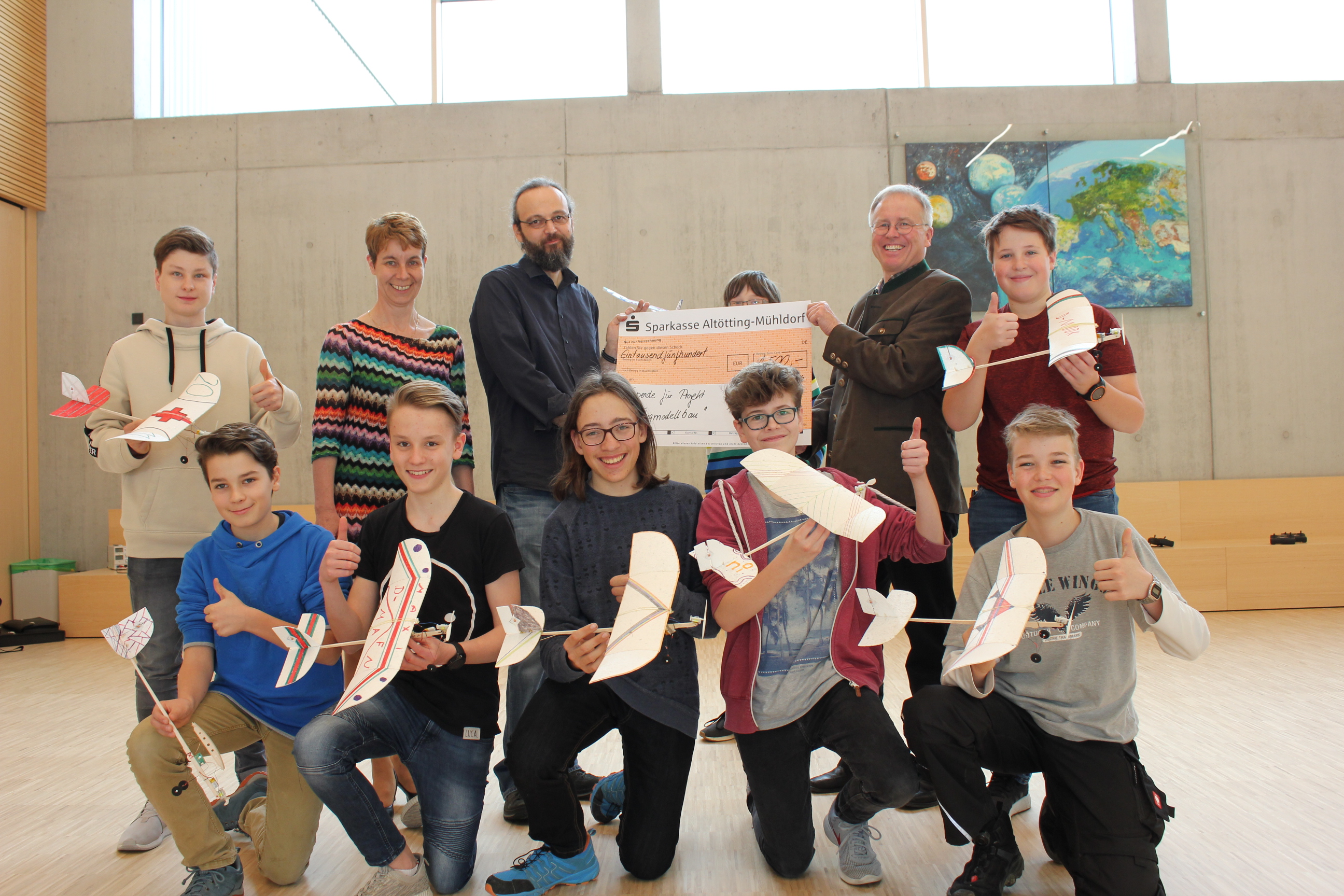 Stolz präsentierten die acht Wahlfach-Teilnehmer ihre Modellflugzeuge bei der Spendenübergabe. Stellvertretende Schulleiterin Silke Wimmer und Lehrer Günter Trager freuten sich über 1.500 EUR.
