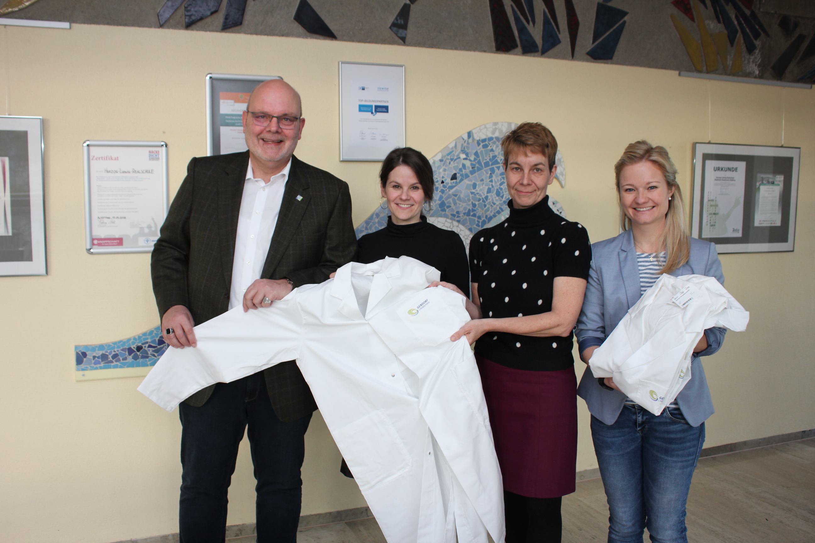 Jochen Volbracht, Leiter der Bildungsakademie (links), und Ausbildungsreferentin Heike Greisinger (rechts) überreichten die Labormäntel an Schulleiterin Silke Wimmer (Mitte rechts) und Chemielehrerin Barbara Gumpendobler.