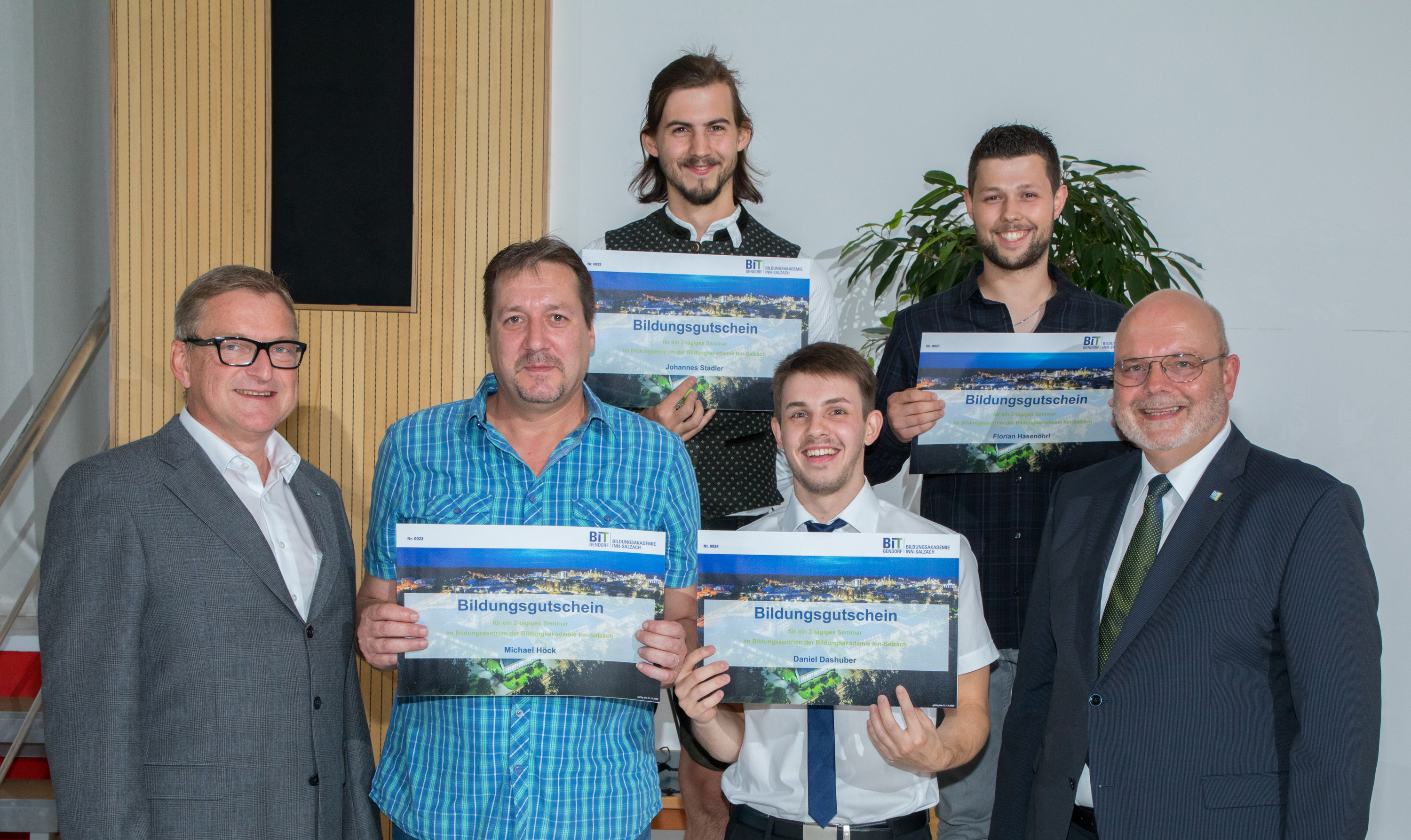 Sie haben ihre Weiterbildung mit Auszeichnung abgeschlossen: (oben v.l.): Johannes Stadler (Maschinenbautechniker), Florian Hasenöhrl (Elektrotechniker), Michael Höck (2.v.l. unten) und Daniel Dashuber (unten 2.v.r., beide Produktionsfachkraft Chemie). Dazu gratulierten Robert Heiß, Geschäftsleiter InfraServ Gendorf (unten links) sowie Jochen Volbracht, Leiter Bildungsakademie Inn-Salzach (unten rechts).